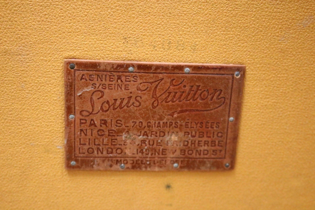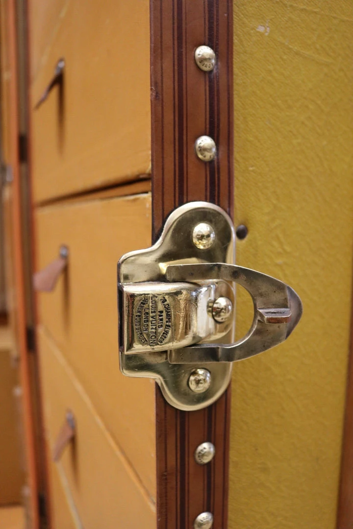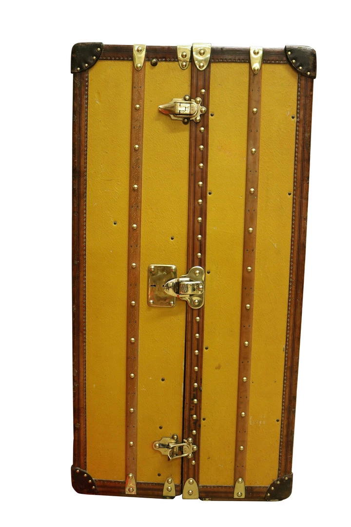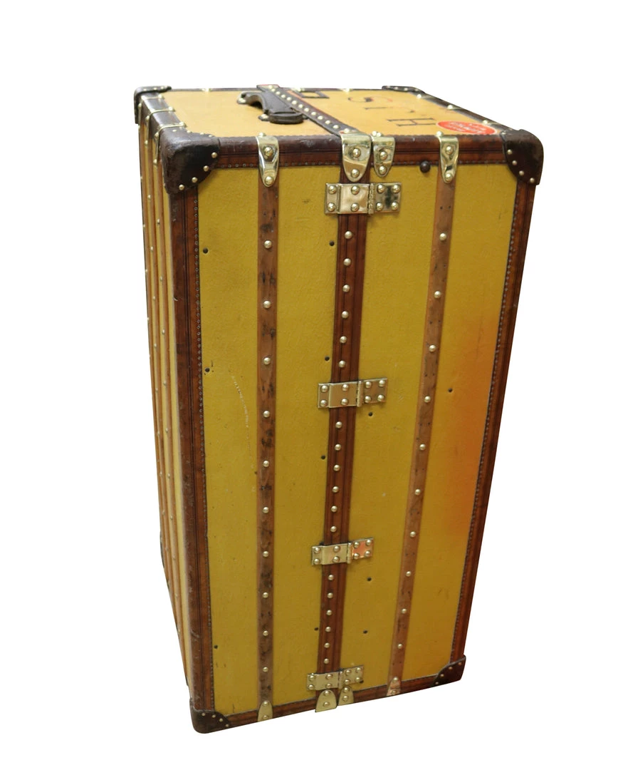 An early 19th Century large vintage Louis Vuitton wardrobe trunk in yellow leather with initials H.J.S stamped on it, along with old travel labels. Inside consists of six storage drawers, a shirt box and hanging clothing rack with the Louis Vuitton Logo stamped onto the handle pulls.Â