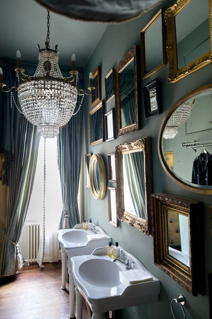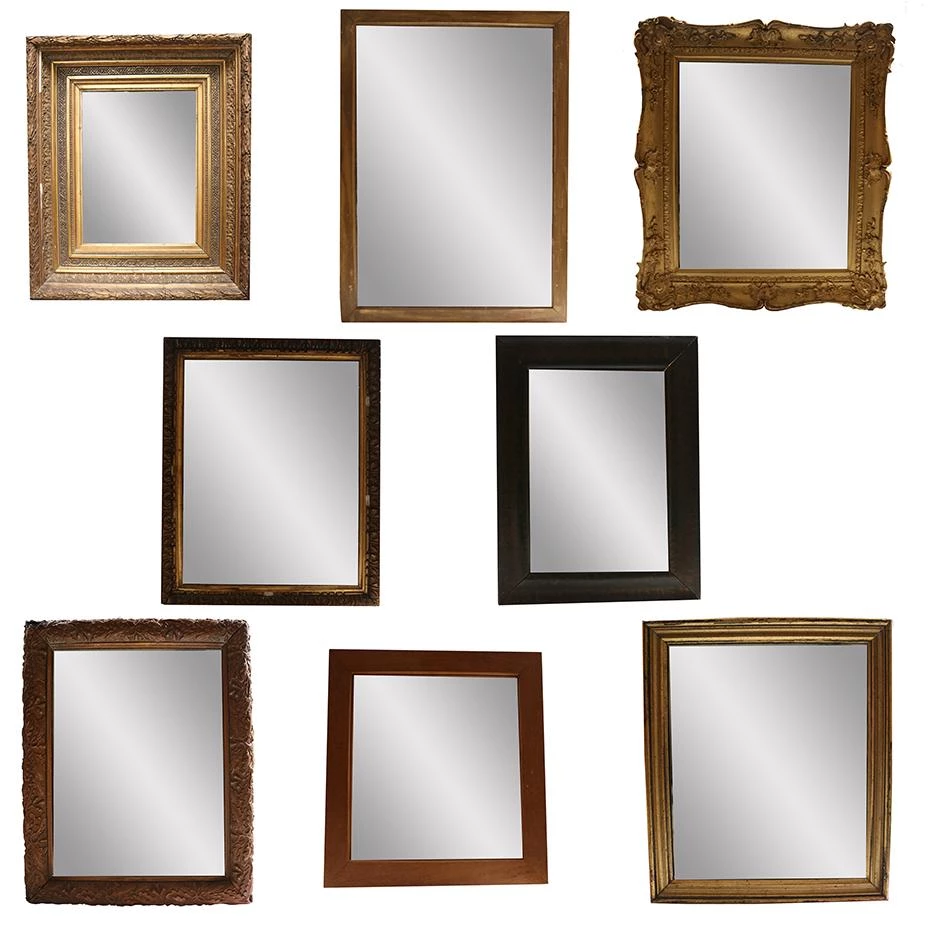 Create a unique feature wall with this collection of antique wood and giltwood mirrors, in various shapes and sizes.