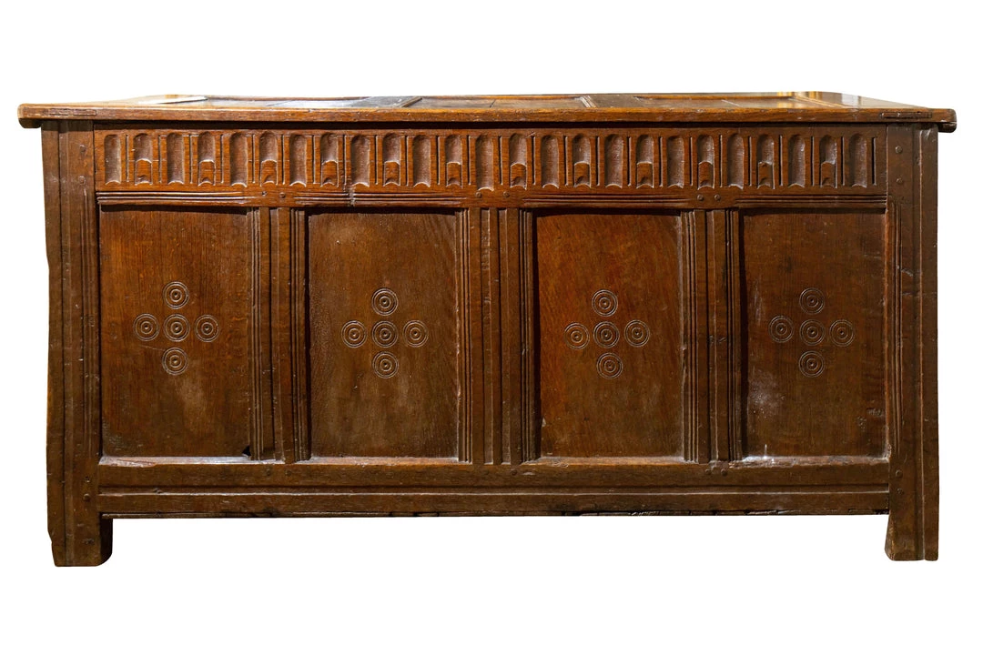 An exceptional George III carved oak coffer, estimated circa 1780. With a four panel front, carved with swirled quatrefoils. A uniquely practical antique item providing both storage and seating functions.