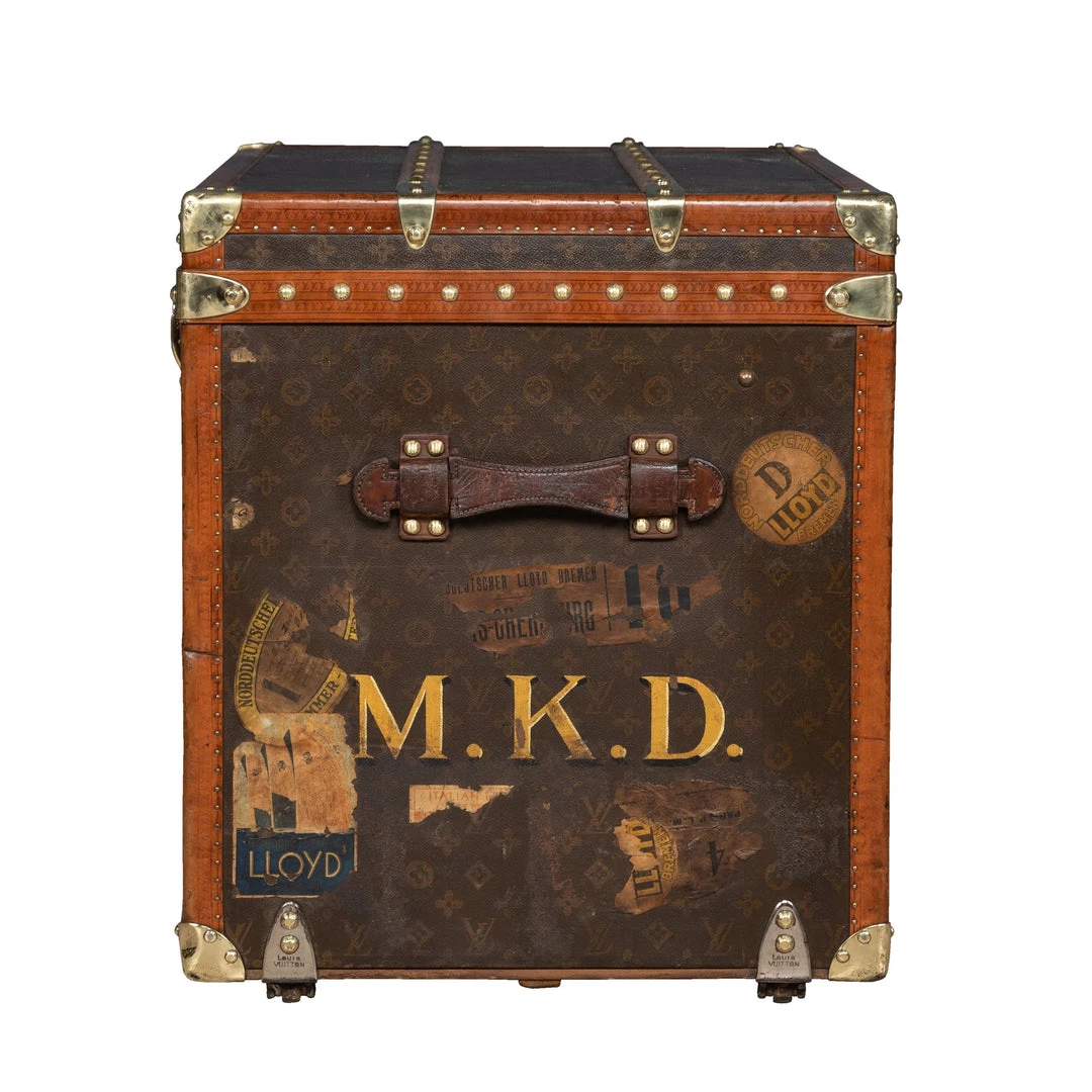 A stunning Louis Vuitton hat trunk in stencilled monogrammed canvas with lozine and brass trim, France, circa 1930. This trunk is a must have item for any elite traveller harking back to times of passenger ships and 1st class travel of bygone eras. Bearing the retail label for Arthur Gilmore, New York, the brass fittings were “top of the range” at Louis Vuitton at the time and today makes for a great conversation piece, a great size for a coffee table or side table suitable for any interior, both modern or traditional.