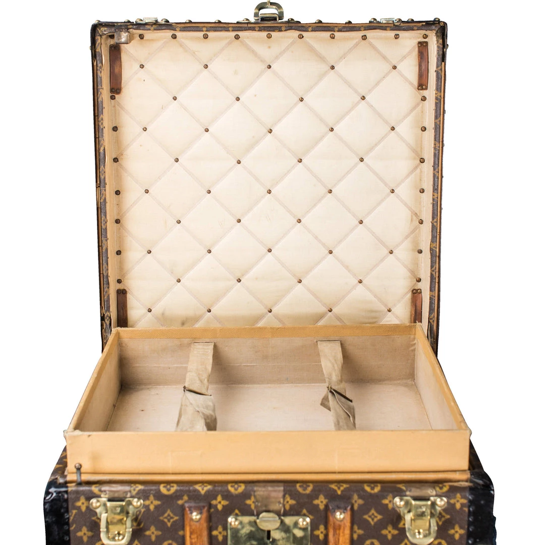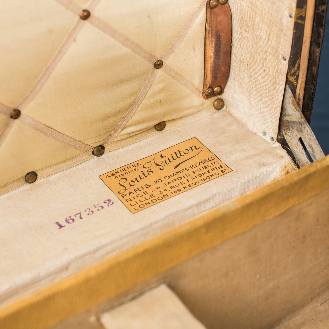 Extremely rare “malle penderie” (gown trunk) by Louis Vuitton, circa 1910. Of huge proportions, standing at an impressive 140cm, this wardrobe was especially constructed for transporting gowns. Finished in the world famous LV monogram canvas, trim in japanned lacquer steel and brass hardware, this wardrobe is in sensational condition and complete inside, including its lift-out tray to the top. Can be laid down horizontally too to make an extra large coffee table, a wonderful statement and conversation piece for any home.