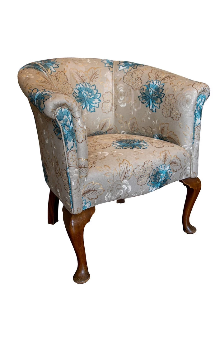 An early 20th century Edwardian tub chair, with curved wooden legs and a beautiful floral pattern with hints of blue and gold upholstery.