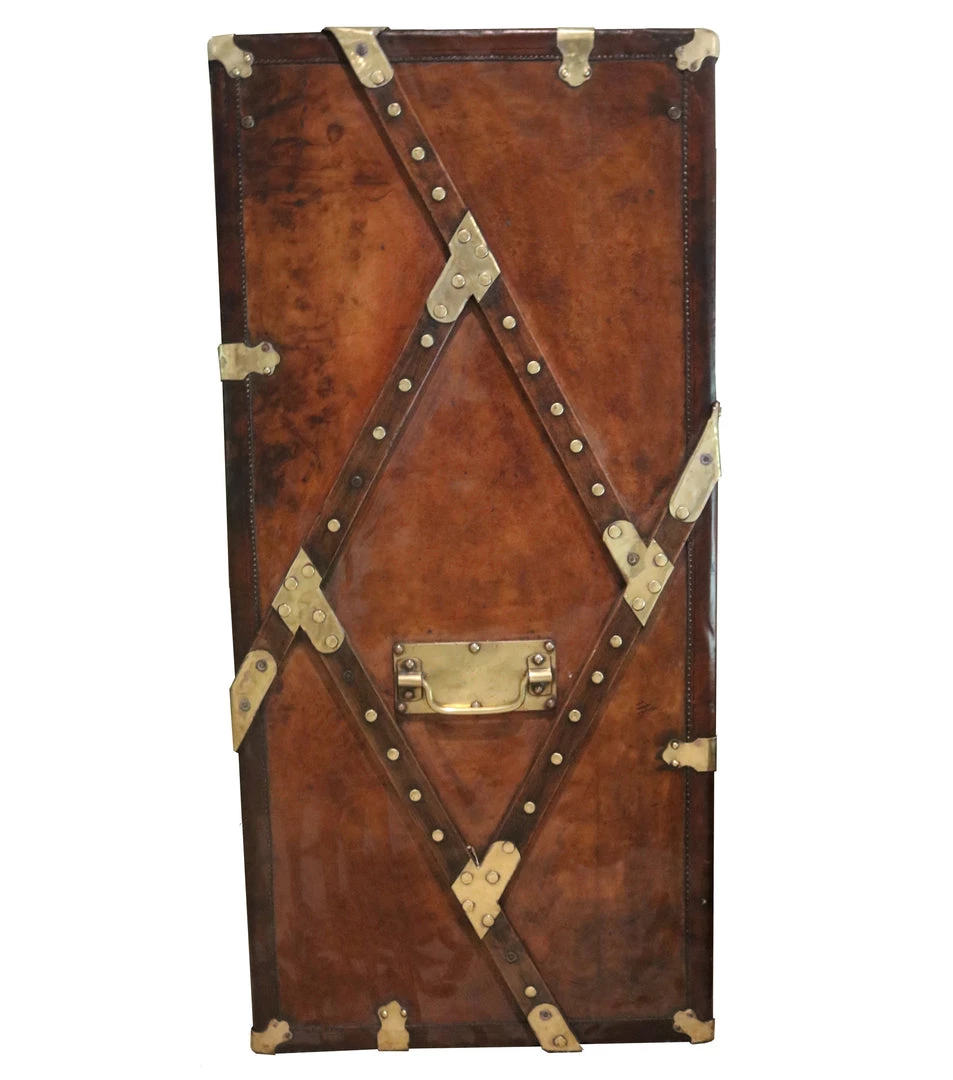 This is a fantastic example of a vintage wardrobe trunk. It consists of a brown leather and wood exterior with a blue floralÂ