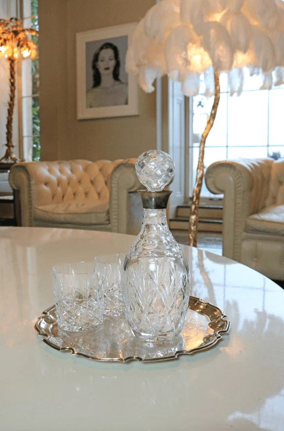 A beautifully diamond cut, bell shaped drinks decanter with silver rim and stopper. Incredibly suited to your most formal and beautiful banquets and perfect for all special occasions.Â