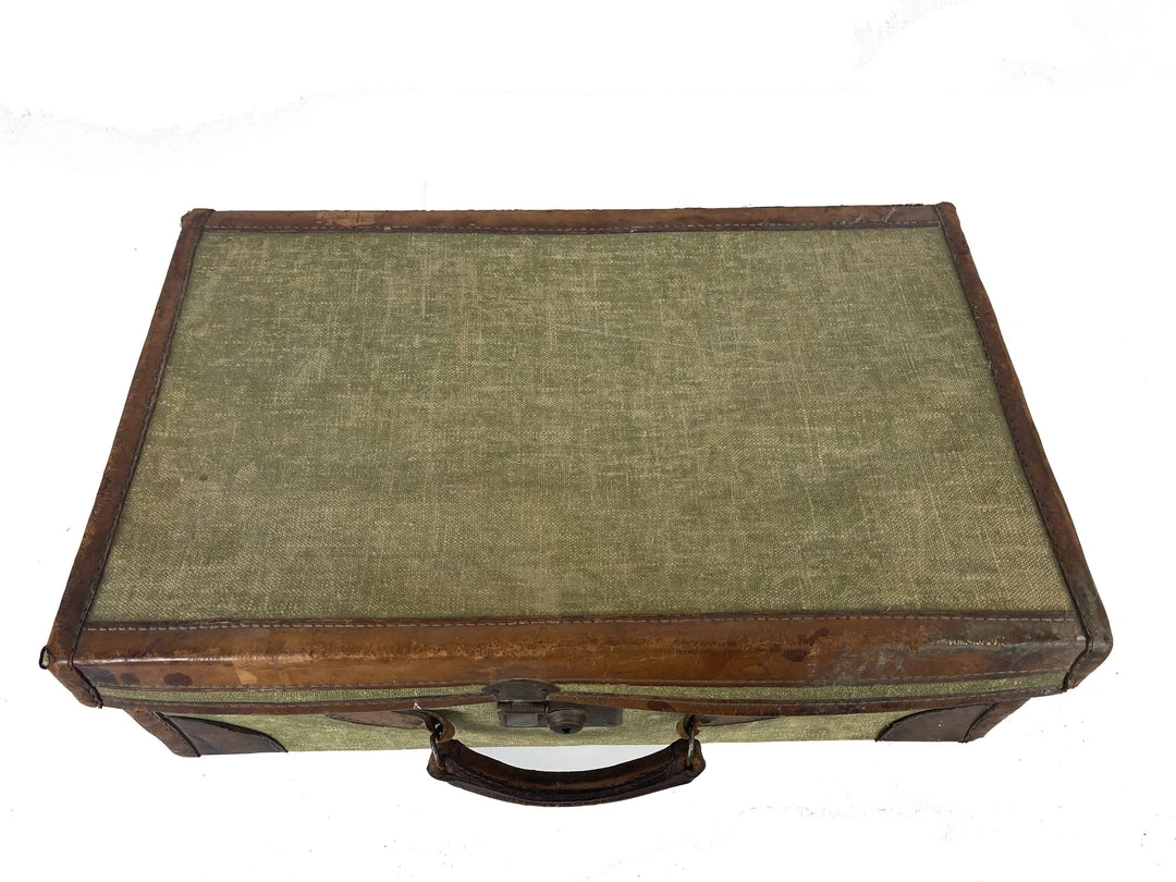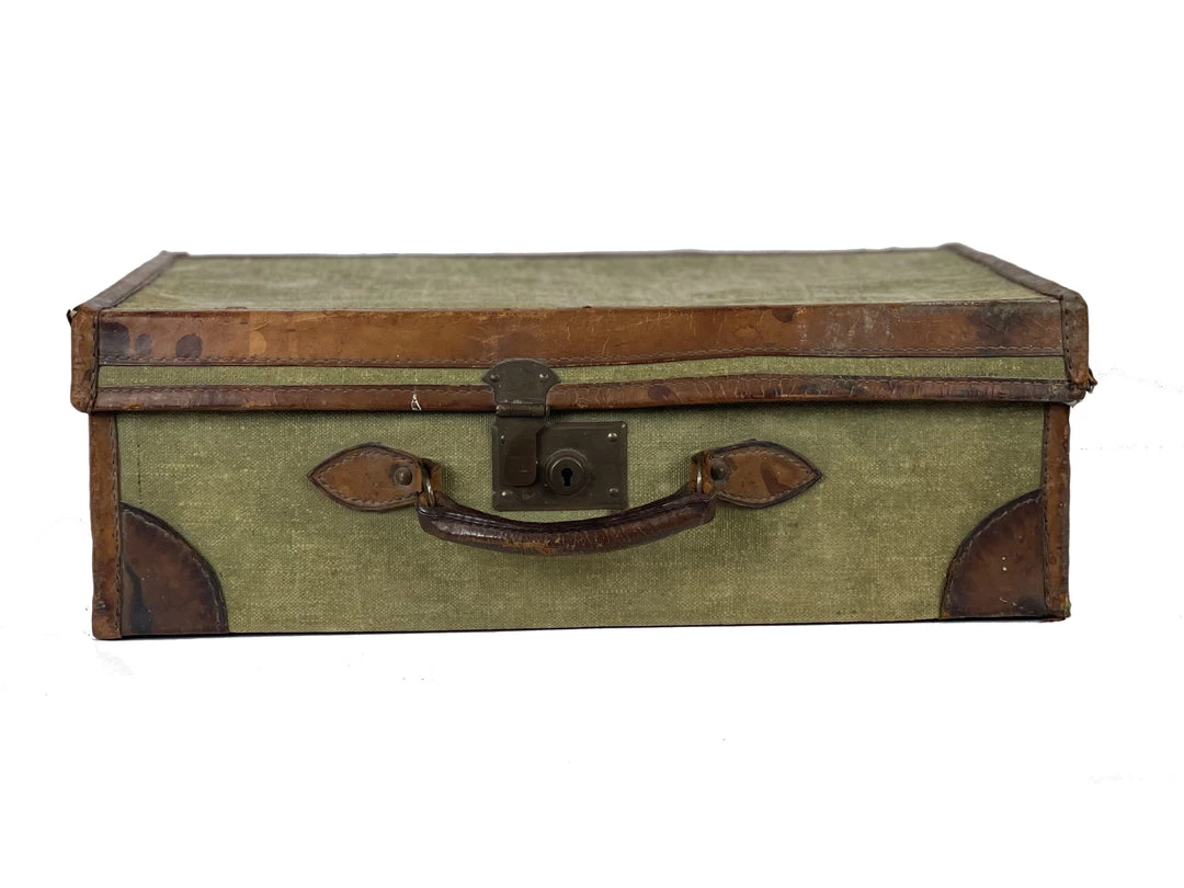 A vintage small green material trunk with brown leather details. Make a statement in your interior setting by creating a stack of these trunks.