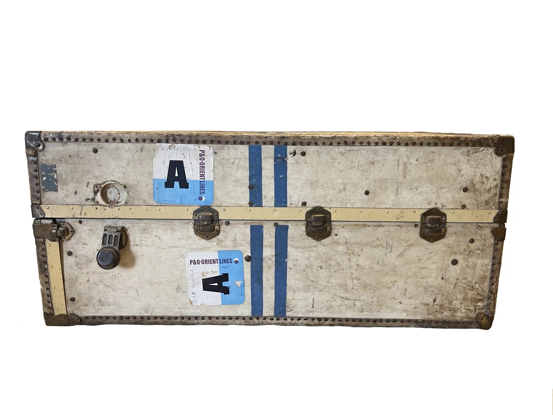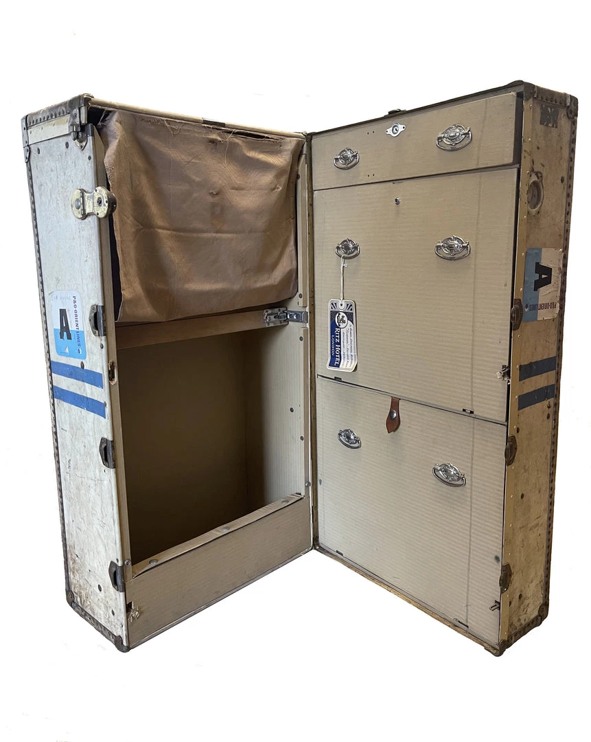 A vintage wardrobe trunk, stamped with old travel labels. Inside consists of three storage drawers and hanging clothing rack.