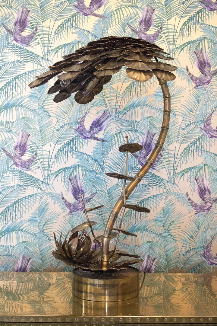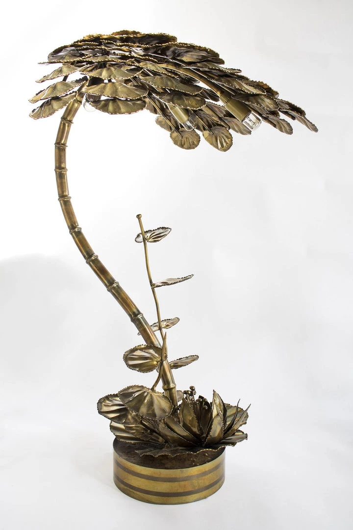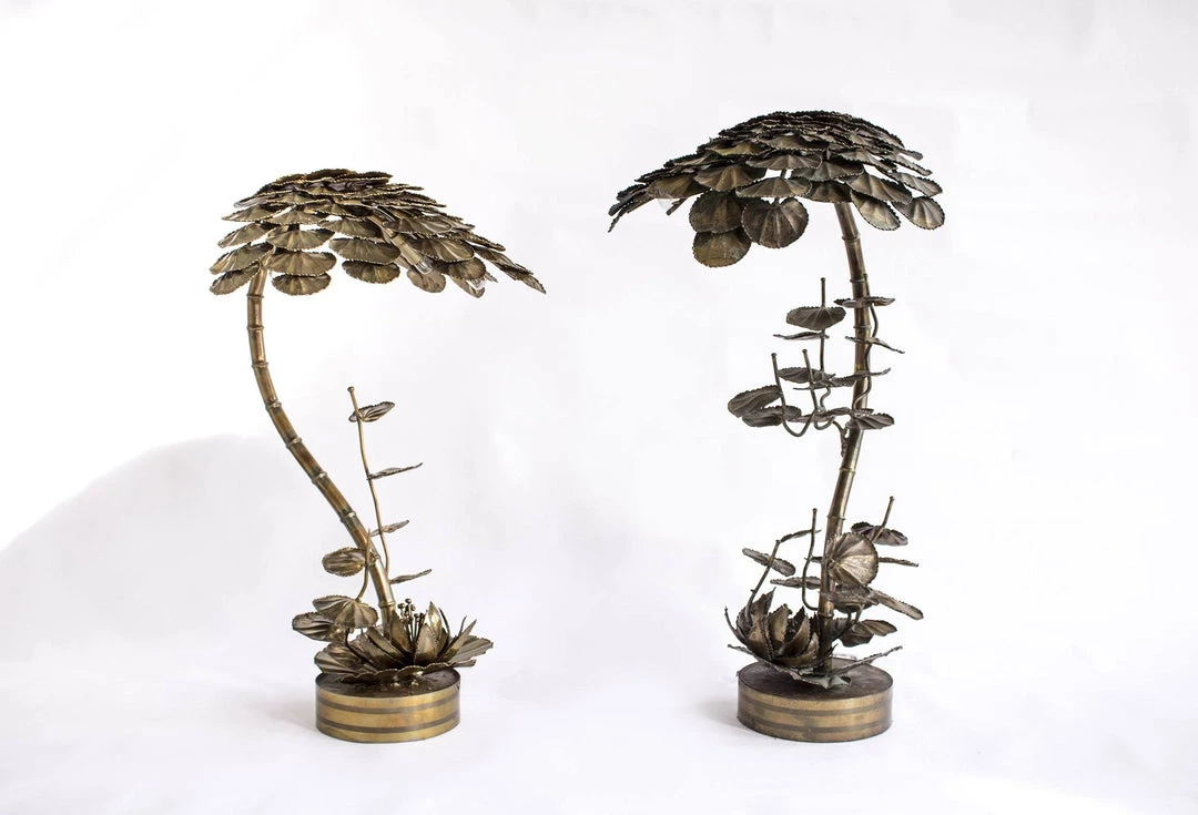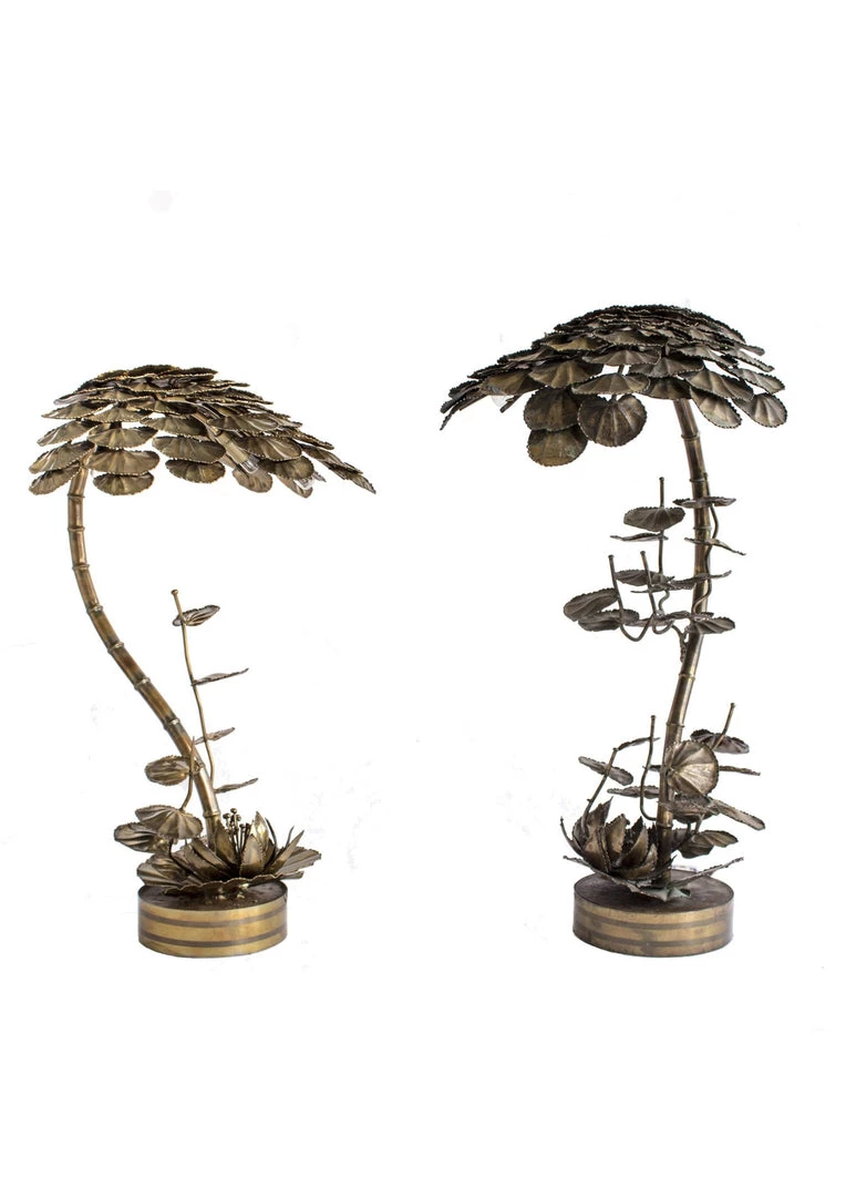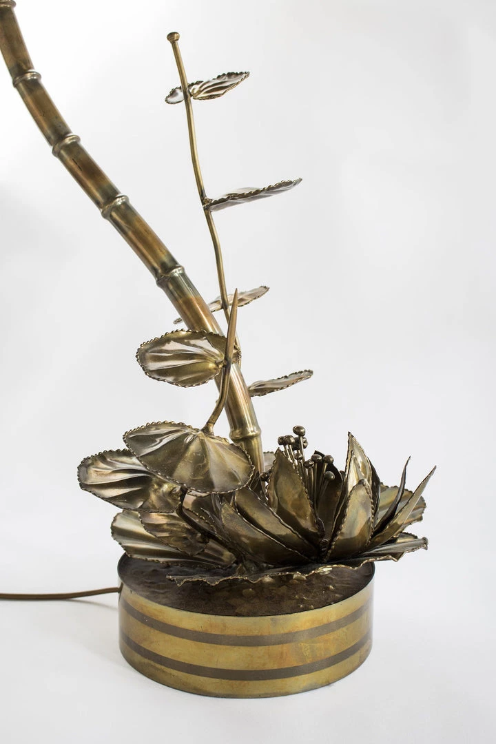 A pair of Mid 20th Century continental stylised waterlilly and bamboo patinated brass lamps of pleasing proportion.