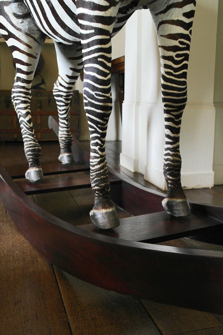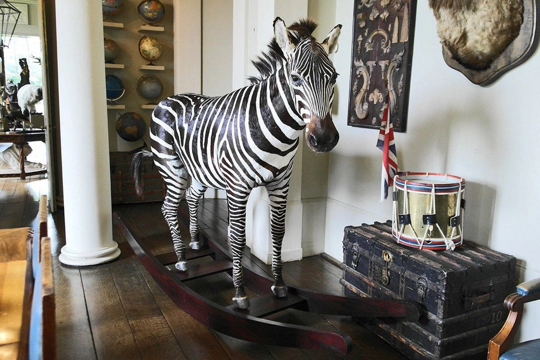 A whimsical taxidermy zebra mounted on traditional carved wooden rockers sits perfectly in the grand dining room of Aynhoe Park – by James Perkins 2013